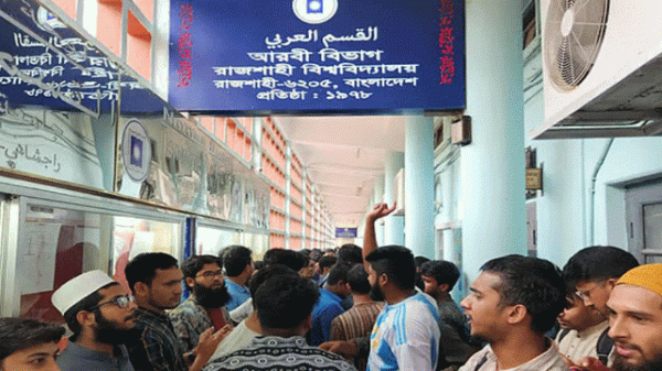 পরীক্ষার চার মাস পেরিয়ে গেলেও ফলাফল না পাওয়ায় অভিনব প্রতিবাদ জানিয়েছেন রাজশাহী বিশ্ববিদ্যালয়ের (রাবি) আরবি বিভাগের চতুর্থ বর্ষের শিক্ষার্থীরা। বিভাগের নোটিশ বোর্ডে ‘ডিপার্টমেন্ট অব অর্ডিন্যান্স, ফরমার আরবি ডিপার্টমেন্ট’ লেখা ব্যানার
