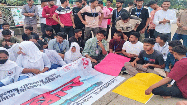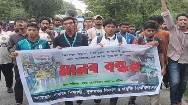 সুনামগঞ্জ-সিলেট সড়ক অবরোধ করে মানববন্ধন করছেন সুনামগঞ্জ বিজ্ঞান ও প্রযুক্তি বিশ্ববিদ্যালয়ের শিক্ষার্থীরা। বিশ্ববিদ্যালয়ের শিক্ষার্থী স্নেহা চক্রবর্তীর মৃত্যুর ঘটনায় দায়ীদের গ্রেপ্তার, ক্ষতিগ্রস্ত পরিবারকে ক্ষতিপূরণ প্রদান ও নিরাপদ সড়কের দাবিতে তারা এ