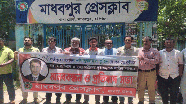 হবিগঞ্জের মাধবপুরে সাংবাদিক আসাদুজ্জামান তুহিন হত্যার প্রতিবাদে এবং সন্ত্রাসীদের দ্রুত গ্রেপ্তারের দাবিতে মানববন্ধন ও প্রতিবাদ সমাবেশ অনুষ্ঠিত হয়েছে। রোববার সকালে মাধবপুর প্রেসক্লাবের উদ্যোগে এ মানববন্ধন ও প্রতিবাদ সভা অনুষ্টিত হয়।