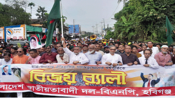 হবিগঞ্জে বর্ণাঢ্য আয়োজনে শেখ হাসিনার পলায়নের বর্ষপূর্তি পালন করা হয়েছে। এ উপলক্ষে জেলা বিএনপির উদ্যোগে বিজয় র্যালি বের করা হয়। দুপুর ২টায় কেন্দ্রীয় ঈদগাহ থেকে র্যালিটি বের হয়ে শহর প্রদক্ষিণ